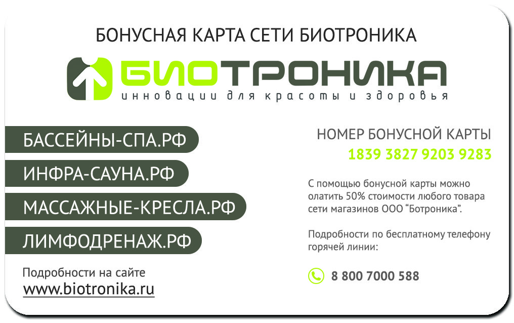 Узнать о количестве накопленных Бонусных рублей вы можете: на сайте www.biotronika.ru или по горячей линии 8 (800) 100-10-78⁠
